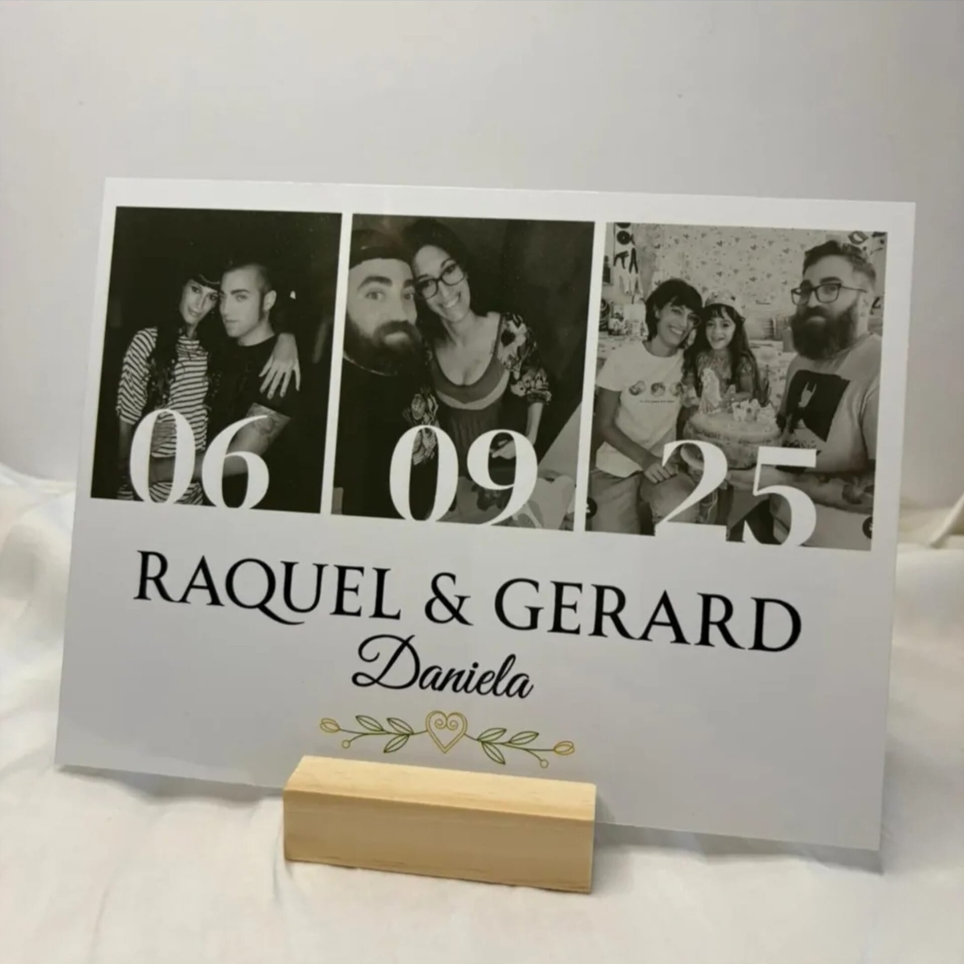 Lámina personalizada de aluminio con soporte de madera para poner tus fotos favoritas, frases o enlaces de spotify con tu canción favorita.